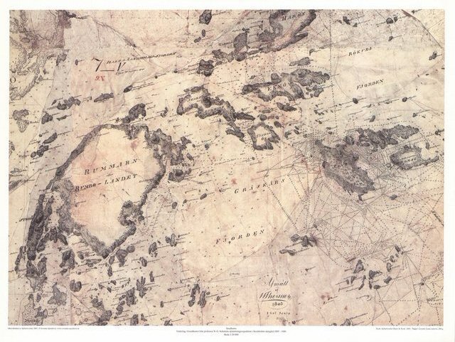 Nyproducerad handkolorerad karta efter äldre manuskriptkarta. Tidigare ej utgiven. Underlaget är en grundkarta från professor N. G. Schulténs sjömätningsexpedition i Stockholms skärgård åren 1805-1811.